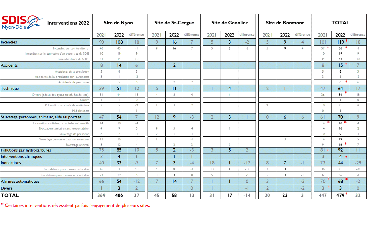 Du 1er janvier au 31 décembre 2022, les groupes d’intervention des 4 sites opérationnels du SDIS Nyon-Dôle, ont été alarmés à 479 reprises.